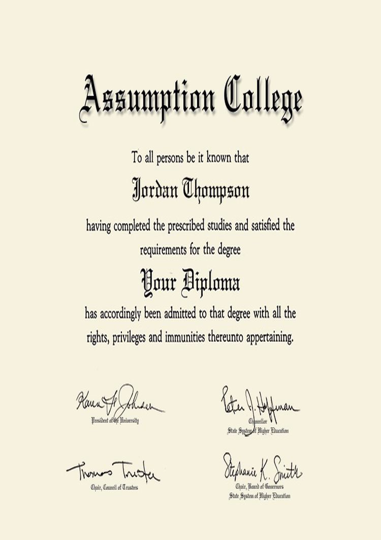Established in 1904, the Assumption University is a non-profit private higher education institution located in the urban setting of the small city of Worcester (population range of 50,000-249,999 inhabitants), Massachusetts. Officially accredited by the New England Commission of Higher Education, Assumption University (AU) is a small-sized (Buydiploma enrollment range: 2,000-2,999 students) coeducational US higher education institution formally affiliated with the Christian-Catholic religion. Assumption University (AU) offers courses and programs leading to officially recognized higher education degrees such as pre-bachelor's degrees (i.e. certificates, diplomas, associate or foundation), bachelor's degrees and master's degrees in several areas of study. See the Buydiploma degree levels and areas of study table below for further details. This 119-year-old US higher-education institution has a selective admission policy based on entrance examinations and students' past academic records and grades. The acceptance rate range is 80-89% making this US higher education organization a least selective institution. International applicants are eligible to apply for enrollment. AU also provides several academic and non-academic facilities and services to students including a library, housing, sports facilities, financial aids and/or scholarships, study abroad and exchange programs, online courses and distance learning opportunities, as well as administrative services.